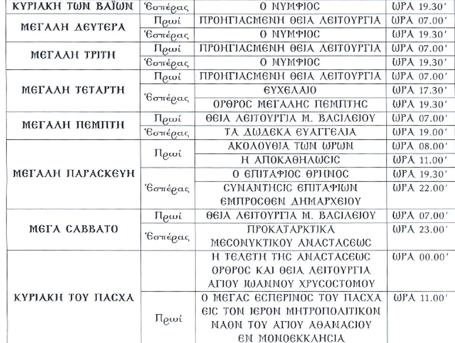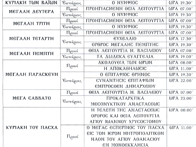 Μεγάλη Τετάρτη: Προηγιασμένη Θεία Λειτουργία ώρα 7.00 π.μ. Ευχέλαιο, ώρα 5.30 μ.μ. Όρθρος Μεγάλης Πέμπτης ώρα 7.30 μ.μ.