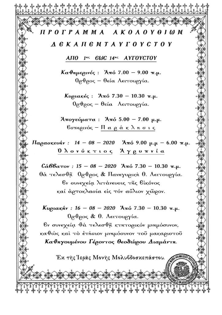 Δείτε αναλυτικά το πρόγραμμα Ακολουθιών Δεκαπενταύγουστου στην Ιερά Μονή Μολυβδοσκεπάστου .